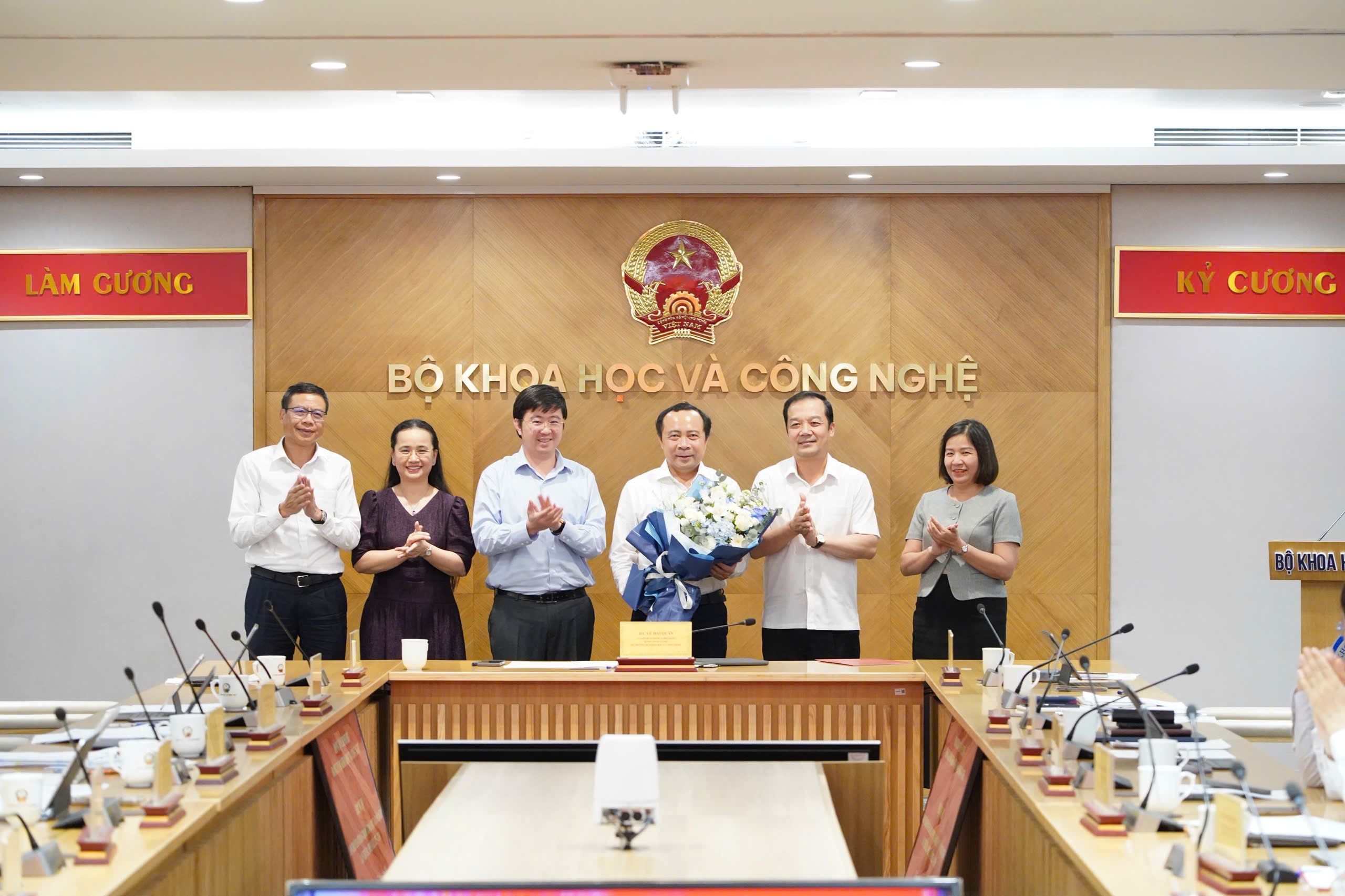Các đại biểu chúc mừng đồng chí Vũ Hải Quân được Đảng ủy Chính phủ chỉ định giữ chức Bí thư Đảng ủy Bộ Khoa học và Công nghệ nhiệm kỳ 2025-2030.