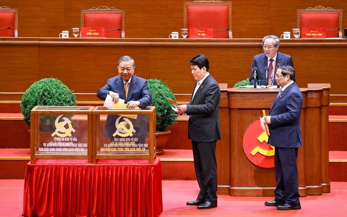 Chiều ngày 22/1/2026, tại Trung tâm Hội nghị Quốc gia (Hà Nội), các đại biểu tham dự Đại hội đại biểu toàn quốc lần thứ XIV của Đảng bỏ phiếu bầu Ban Chấp hành Trung ương Đảng Cộng sản Việt Nam khóa XIV. Đồng chí Tổng Bí thư Tô Lâm - Chủ tịch Đoàn Chủ tịch thay mặt Đoàn Chủ tịch điều hành phiên họp.